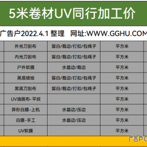 喷绘材料打画一般都用写真机或者喷绘机,如果对画面有更高寿命要求,才会用uv打印工艺。2022年4月1日卷材UV同行加工价格表: